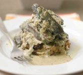 - 2 Heat a griddle pan. Thinly slice the courgettes lengthways, then toss in olive oil and seasoning. When the griddle is hot, add the courgettes in batches cooking them for two minutes each side until charred. Set aside to cool slightly.